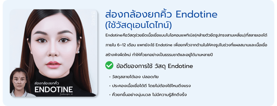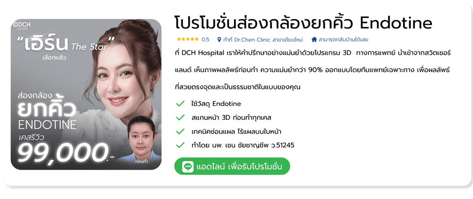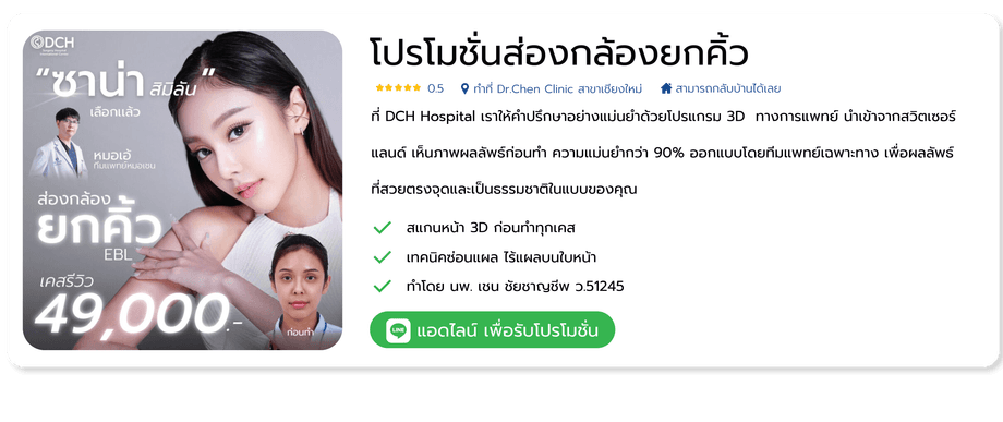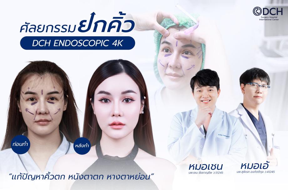 คุณหมอเชนและหมอเอ้ จะใช้เป็นเทคนิค DCH EBL Endoscopic 4K เทคนิคการยกคิ้ว ยกหางตา ลดรอยย่นหน้าผาก รอบดวงตา ทำการดึงผิวหนังขึ้นสู่ด้านบนไปด้วยกันในครั้งเดียว ด้วยเทคโนโลยีผ่าตัดด้วยกล้อง Endoscope 4K เป็นการผ่าตัดที่เห็นทุกรายละเอียดผ่านทางจอมอนิเตอร์ โดยแพทย์ผู้มีประสบการณ์กำหนดจุดเปิดปิดแผลเพื่อสอดกล้อง แผลสั้น แผลมีขนาดเล็ก ฟื้นตัวไว ซ่อนแผลอยู่ในบริเวณไรผม วิธีมีความปลอดภัย ลดโอกาสการติดเชื้อ ไม่มีรอยแผลบนใบหน้า ผลลัพธ์จะดูเป็นธรรมชาติ บริเวณหน้าผากและคิ้วให้ดูอ่อนเยาว์ หน้าเด็กลง ช่วยคุณกลับคืนสู่ใบหน้าที่อ่อนเยาว์อีกครั้ง และยังช่วยเสริมเรื่องโหงวเฮ้ง