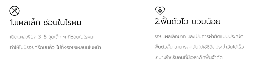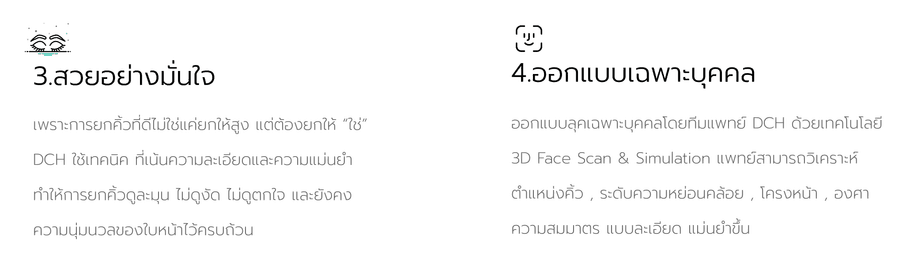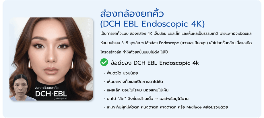 เทคนิค DCH EBL Endoscopic 4K เทคนิคการยกคิ้ว ยกหางตา ลดรอยย่นหน้าผาก รอบดวงตา ทำการดึงผิวหนังขึ้นสู่ด้านบนไปด้วยกันในครั้งเดียว ด้วยเทคโนโลยีผ่าตัดด้วยกล้อง Endoscope 4K เป็นการผ่าตัดที่เห็นทุกรายละเอียดผ่านทางจอมอนิเตอร์ โดยแพทย์ผู้มีประสบการณ์กำหนดจุดเปิดปิดแผลเพื่อสอดกล้อง แผลสั้น แผลมีขนาดเล็ก ฟื้นตัวไว ซ่อนแผลอยู่ในบริเวณไรผม วิธีมีความปลอดภัย ลดโอกาสการติดเชื้อ ไม่มีรอยแผลบนใบหน้า