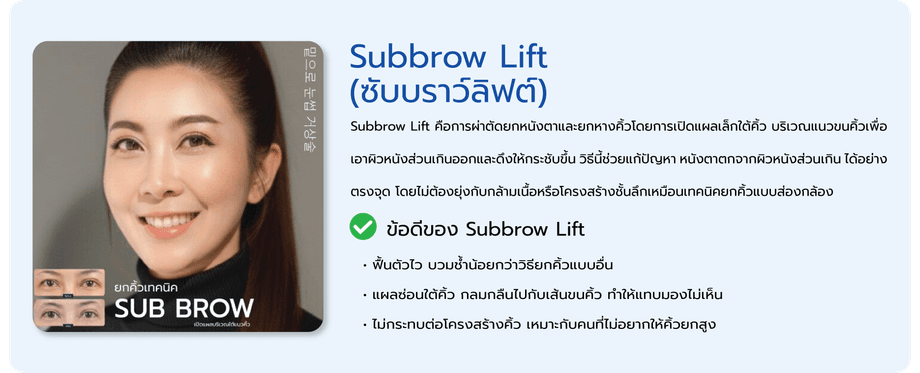 ทำไมต้องศัลยกรรมยกคิ้วปัญหาการหย่อนคล้อยของใบหน้า ทำให้คิ้วมีลักษณะลู่ตกลงด้านข้าง หางคิ้วอยู่ในตำแหน่งต่ำกว่าปกติ มักเกิดขึ้นพร้อมกับปัญหาหางตาตก ทำให้ดวงตาดูตก แววตาดูเศร้า ตาดุ สาเหตุของภาวะคิ้วตกยังอาจส่ง ผลกระทบต่อการมองเห็น ส่วนริ้วรอยที่หน้าผาก ก็มักจะเกิดขึ้นร่วมด้วยอยู่แล้ว ทำให้ดูมีอายุมากขึ้น ปัจจุบันสามารถ แก้ไขปัญหาได้คือการผ่าตัดศัลยกรรม ช่วยเพิ่มพื้นที่ระหว่างคิ้วกับดวงตา ทำให้มีที่ว่างระหว่างคิ้วกับดวงตามากขึ้น